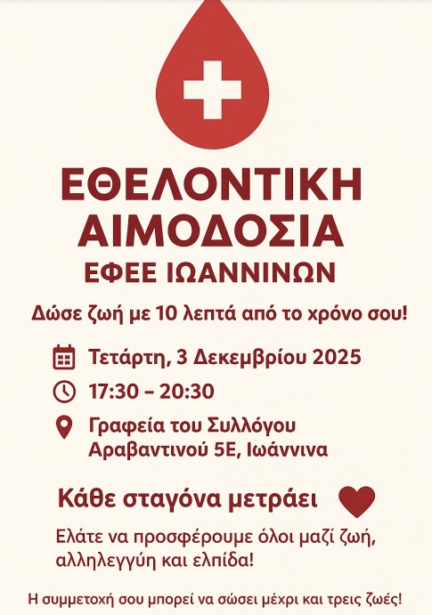 Η δράση διοργανώνεται σε συνεργασία με το τμήμα αιμοδοσίας του Γενικού Νοσοκομείου Ιωαννίνων Χατζηκώστα και αποσκοπεί στην ενίσχυση των αποθεμάτων αίματος για τις ανάγκες ασθενών που το έχουν άμεση ανάγκη.