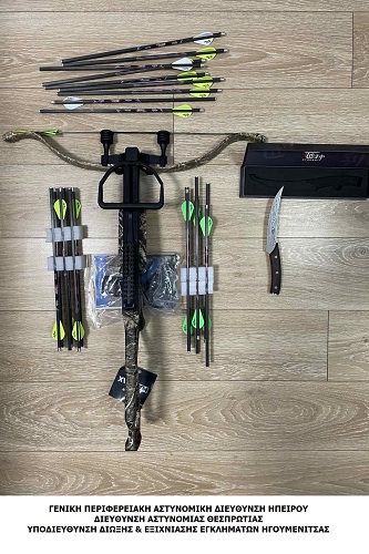 Ειδικότερα, στο πλαίσιο ελέγχου από υπαλλήλους του Τελωνείου Μαυροματίου κατά την έξοδο του αλλοδαπού από τη χώρα, βρέθηκαν στην κατοχή του βαλλίστρα με -21- βέλη, καθώς και μαχαίρι συνολικού μήκους -28- εκατοστών, τα οποία κατασχέθηκαν.