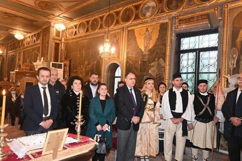 Η τελετή συνεχίστηκε έμπροσθεν του Ιερού Ναού όπου Βρίσκεται η περίτεχνη μαρμάρινη Λάρνακα όπου είναι εναποτεθειμένα τα οστά του Αλέξανδρου Υψηλάντη.