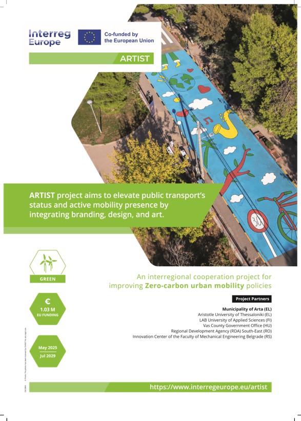 Το έργο ARTIST, το οποίο υλοποιείται στο πλαίσιο του προγράμματος InterregEurope (2021–2027) υπό τη συγχρηματοδότηση της Ευρωπαϊκής Ένωσης, έχει ως επικεφαλής εταίρο τον Δήμο Αρταίων και περιλαμβάνει ένα ισχυρό εταιρικό σχήμα από την Ελλάδα, την Ουγγαρία, τη Ρουμανία, τη Φινλανδία και τη Σερβία. Με συνολικό προϋπολογισμό 1,29 εκατ. ευρώ, το πρόγραμμα στοχεύει στην ενίσχυση της βιώσιμης κινητικότητας και τη μείωση του περιβαλλοντικού αποτυπώματος (CO₂)μέσα από την ενσωμάτωση της τέχνης, του design και του branding. Στρατηγικός σκοπός του έργου για την περιοχή της Άρτας είναι η αναθεώρηση του Σχεδίου Βιώσιμης Αστικής Κινητικότητας (ΣΒΑΚ) για τη μετάβαση προς ελκυστικά και συμπεριληπτικά συστήματα μεταφορών και η βελτίωση της εμπειρίας των χρηστών με την αξιοποίηση καλλιτεχνών και πολιτιστικών στοιχείων.