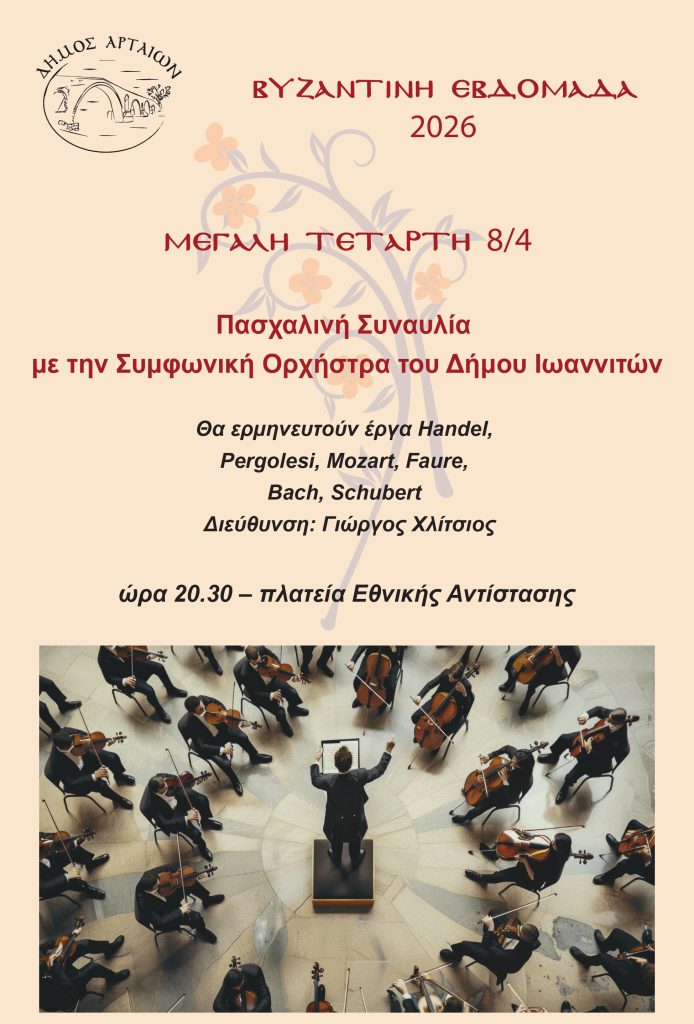 Στο πλαίσιο της «Βυζαντινής Εβδομάδας 2026», ο Δήμος Αρταίων διοργανώνει μία ξεχωριστή Συναυλία, τη Μεγάλη Τετάρτη 8 Απριλίου 2026, στην πλατεία Εθνικής Αντίστασης.