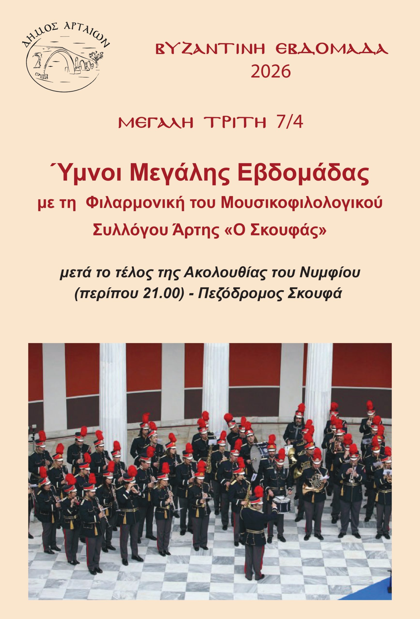 Στο πλαίσιο της «Βυζαντινής Εβδομάδας 2026», ο Δήμος Αρταίων διοργανώνει μία ξεχωριστή Συναυλία, τη Μεγάλη Τετάρτη 8 Απριλίου 2026, στην πλατεία Εθνικής Αντίστασης.