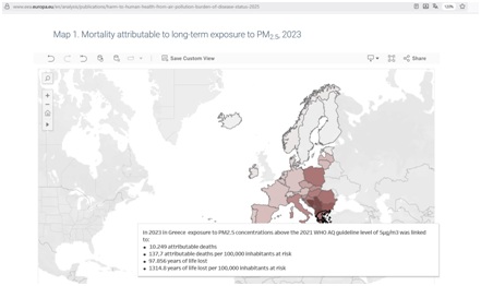 Εικόνα 1. Χάρτης EEA: Θνησιμότητα που αποδίδεται στη μακροχρόνια έκθεση λόγω PM2.5 στην Ελλάδα, 2023. Πηγή: European Environment Agency (EEA), Harm to human health from air pollution in Europe: burden of disease status, 2025.