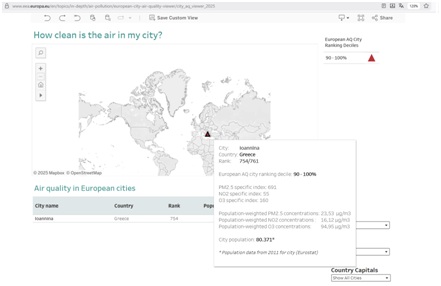 Τα πλέον πρόσφατα στοιχεία στοιχεία του EEA για την ποιότητα του αέρα στις ευρωπαϊκές πόλεις (έκδοση Ιούλιος 2025) αποκαλύπτουν μία ιδιαίτεραανησυχητική εικόνα για τα Ιωάννινα: