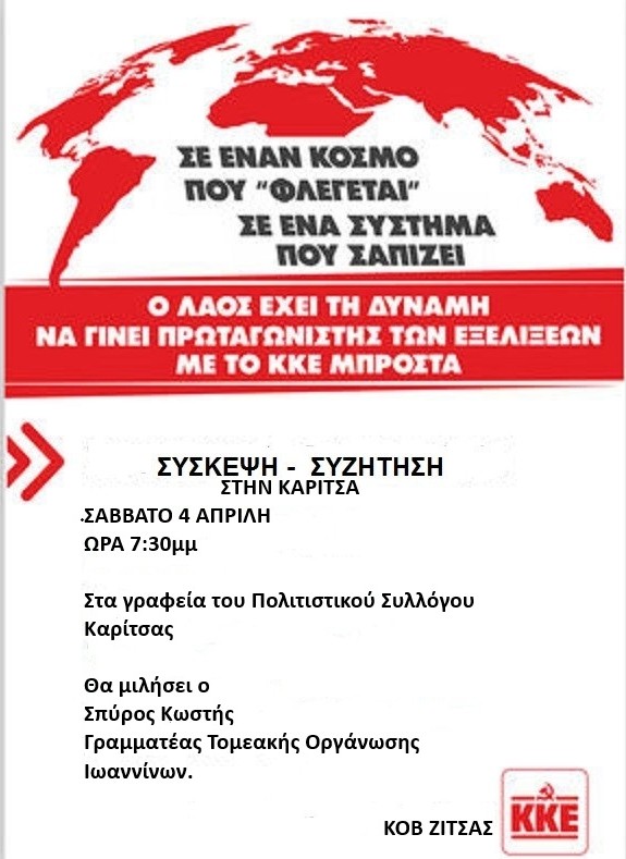 - Το Σάββατο 4 Απρίλη, στις 19.30, στην Καρίτσα, στα γραφεία του Πολιτιστικού Συλλόγου Καρίτσας, καλεί η ΚΟΒ Ζίτσας, όπου θα μιλήσει ο Σπύρος Κωστής, Γραμματέας της Τομεακής Οργάνωσης Ιωαννίνων του ΚΚΕ και μέλος της Επιτροπής Περιοχής Ηπείρου-Κέρκυρας-Λευκάδας του ΚΚΕ