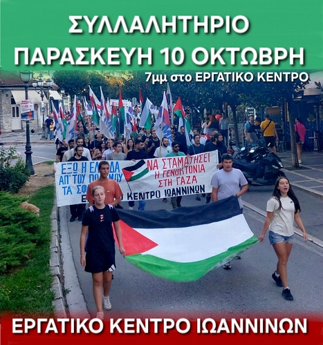 Το Εργατικό Κέντρο Ιωαννίνων καλούμε όλα τα σωματεία, τους συλλόγους και τους φορείς, όλους τους εργαζόμενους και τη νεολαία της πόλης για ακόμα μια φορά να διαδηλώσουμε, να καταδικάσουμε το συνεχιζόμενο έγκλημα κατά του παλαιστινιακού λαού. Να φωνάξουμε ξανά ΛΕΥΤΕΡΙΑ ΣΤΗΝ ΠΑΛΑΙΣΤΙΝΗ, να εκφράσουμε ξανά την αλληλεγγύη μας στον παλαιστινιακό λαό!
