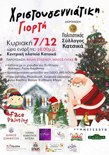 To Δ.Σ. του Πολιτιστικού Συλλόγου Κατσικά σας προσκαλεί και φέτος στην όμορφη Χριστουγεννιάτικη γιορτή που θα διοργανώσει την Κυριακή 7 Δεκεμβρίου 2025 και ώρα 16:00 στην κεντρική πλατεία του Κατσικά. Σας περιμένουμε όλους με χαρά να δημιουργήσουμε τις πιο όμορφες χριστουγεννιάτικες αναμνήσεις!Παρουσίαση: ΒίλιανΣτασινού& Μίλτος Γήτας