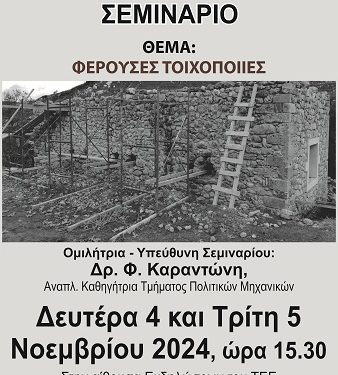 Το Τμήμα Ηπείρου του ΤΕΕ διοργανώνει Διήμερο Τεχνικό Σεμινάριο με θέμα : ΦΕΡΟΥΣΕΣ ΤΟΙΧΟΠΟΙΙΕΣ Την Δευτέρα 4 Νοεμβρίου και την Τρίτη 5 Νοεμβρίου 2024 με ώρα έναρξης 15.30 στην αίθουσα Εκδηλώσεων του ΤΕΕ στην Οδό Αραβαντινού 6-8 στα Ιωάννινα. Ομιλήτρια και υπεύθυνη του Σεμιναρίου είναι η Δρ. Φ. Καραντώνη Αναπληρώτρια Καθηγήτρια του Τμήματος Πολιτικών Μηχανικών. Αναλυτικά το πρόγραμμα του σεμιναρίου έχει ως εξής: