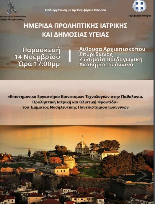 Διοργάνωση: Περιφέρεια Ηπείρου και Επιστημονικό Εργαστήριο Καινοτόμων Τεχνολογιών στην Παθολογία, Προληπτική Ιατρική και Ολιστική Φροντίδα του Τμήματος Νοσηλευτικής Πανεπιστημίου Ιωαννίνων
