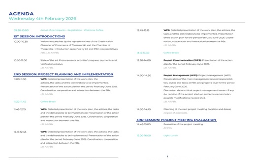 Παράλληλα, θα συζητηθούν θέματα που αφορούν την επικοινωνία και την προβολή του έργου, τον καλύτερο συντονισμό των εταίρων και την οργάνωση κοινών πρωτοβουλιών το επόμενο διάστημα. Η συνάντηση φιλοδοξεί να αποτελέσει σημείο ανταλλαγής εμπειριών και καλών πρακτικών, συμβάλλοντας στην αποτελεσματική υλοποίηση του έργου και στη μεγιστοποίηση των οφελών για τις τοπικές κοινωνίες και τους παραγωγούς.