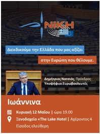 Ο πρόεδρος του κινήματος ΝΙΚΗ Δημήτρης Νατσιός θα έρθει στα Ιωάννινα την Κυριακή 12 Μαΐου 2024 και ώρα 7μμ, για να συμμετάσχει στην κεντρική εκδήλωση της Ηπείρου, που θα διοργανώσει το Κίνημα, ενόψει των Ευρωεκλογών στο Ξενοδοχείο The Lake Hotel, Αχέροντος 4. Θα συνοδεύεται από δεκατέσσερις υποψηφίους Ευρωβουλευτές, που με αλφαβητική σειρά είναι οι εξής: Ζλατίντση Παρασκευή, Ιατρίδου Δέσποινα, Ιντζές Ιωάννης, Καλυβιώτης Ραφαήλ, Κυριακού Κωνσταντίνος, Μαγγίνα Μαρίνα, Μακρυδάκη Φιλοθέη, Μεταλληνός Δημήτριος, Μπαλιάκας Κωνσταντίνος, Πελίδου Συγκλητή-Ερριέτα, Σαμαράς-Χριστιανίδης Ανέστης, Τσαρούχα Ζωή, Χατζηδάκης Κωνσταντίνος, Χιωτακάκος Δημήτριος.