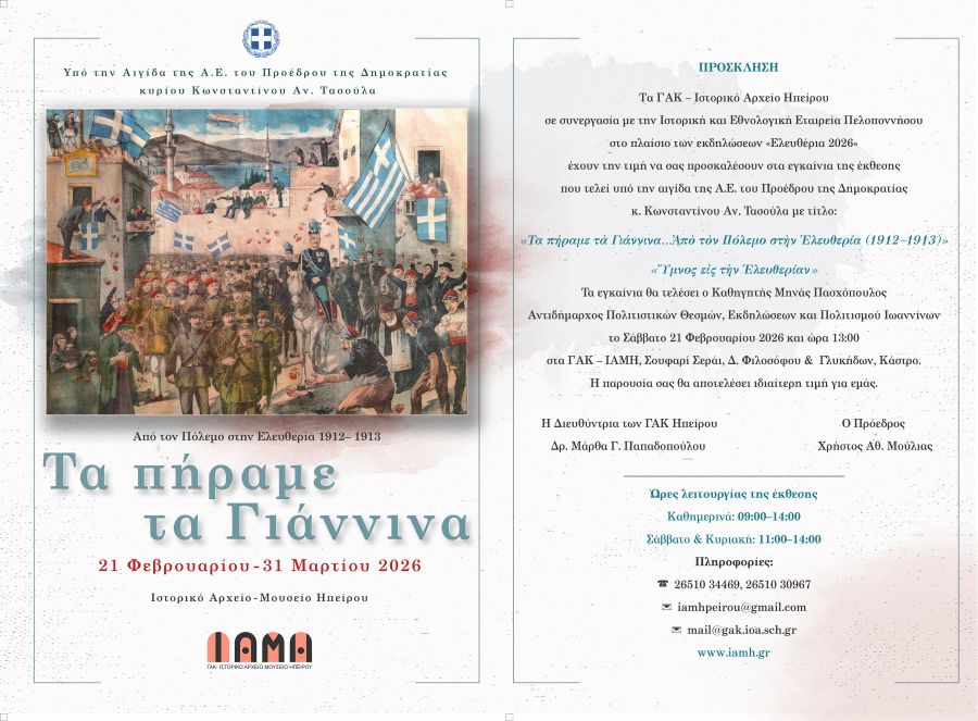 Στο πλαίσιο των εορταστικών εκδηλώσεων «Ελευθέρια 2026», που τιμούν την απελευθέρωση της πόλης των Ιωαννίνων, τα Γενικά Αρχεία του Κράτους – Κεντρική Υπηρεσία και το ΓΑΚ – Ιστορικό Αρχείο Ηπείρου, σε συνεργασία με την Ιστορική και Εθνολογική Εταιρεία Πελοποννήσου και υπό την αιγίδα της Α.Ε. του Προέδρου της Ελληνικής Δημοκρατίας κ. Κωνσταντίνου Αν. Τασούλα, διοργανώνουν την έκθεση «Τα πήραμε τα Γιάννινα… Από τον Πόλεμο στην Ελευθερία (1912–1913)».