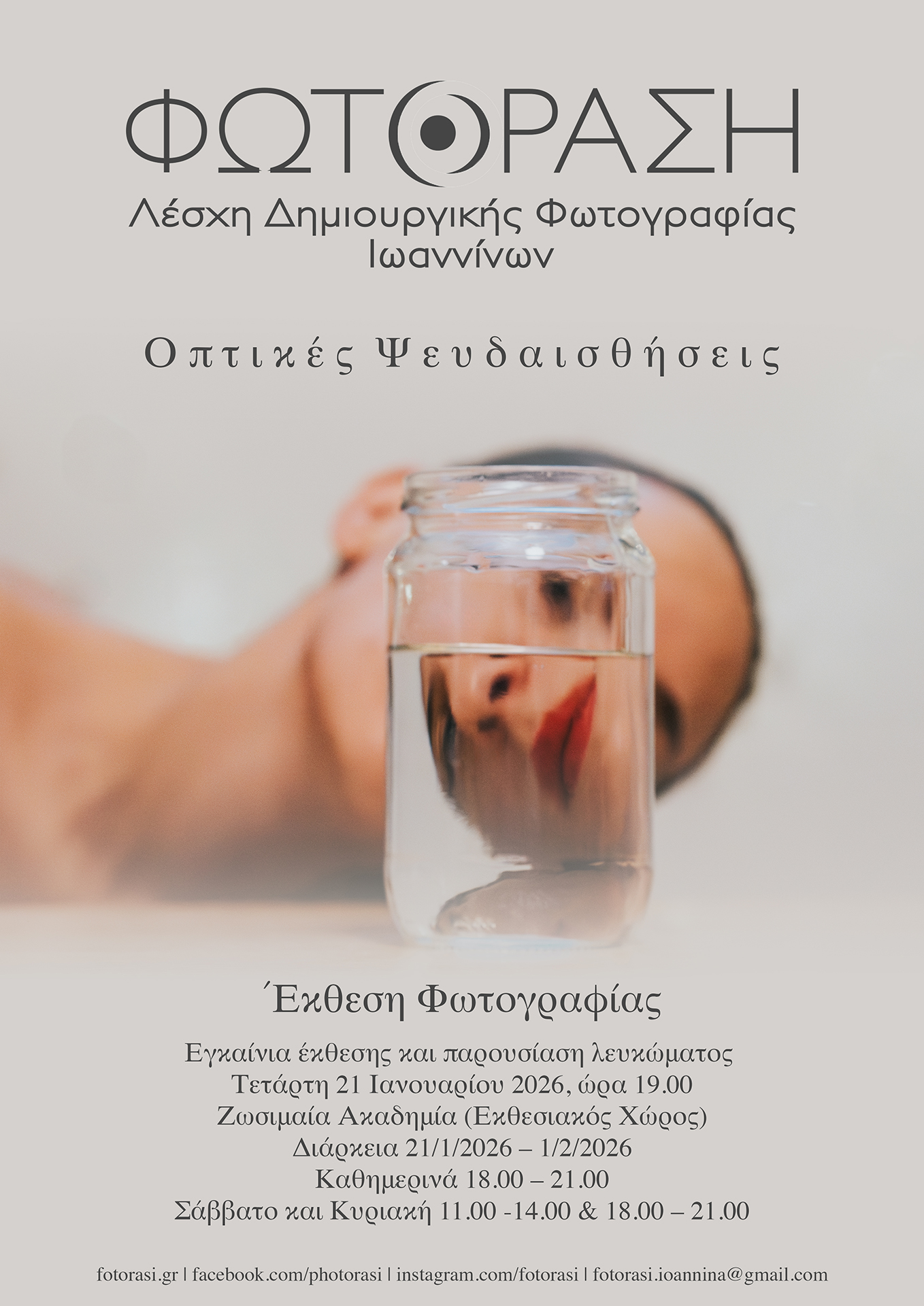 Η Λέσχη δημιουργικής φωτογραφίας Ιωαννίνων «ΦΩΤΟΡΑΣΗ», θα πραγματοποιήσει στη Ζωσιμαία Ακαδημία (Εκθεσιακός Χώρος) την ετήσια έκθεση Φωτογραφίας και την παρουσίαση του φωτογραφικού Λευκώματος με τίτλο “Οπτικές Ψευδαισθήσεις”