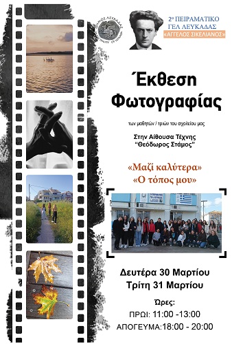 Η φετινή έκθεση φωτογραφίας του 2ου Πειραματικού Λυκείου Λευκάδας «Άγγελος Σικελιανός» έχει ως κεντρικό θέμα: «Ο τόπος μου» και «Μαζί καλύτερα».