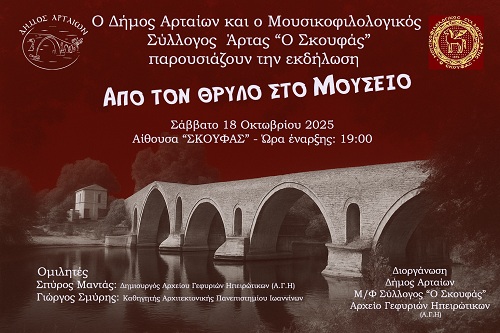 Μια σπουδαία εκδήλωση με τίτλο «Από τον Θρύλο στο Μουσείο», συνδιοργανώνουν το Σάββατο 18 Οκτωβρίου 2025και ώρα 19:00, στην αίθουσα «Σκουφάς», ο Δήμος Αρταίων, ο Μουσικοφιλολογικός Σύλλογος Άρτας «Ο Σκουφάς» και το Αρχείο Γεφυριών Ηπειρώτικων (Α.Γ.Η.)