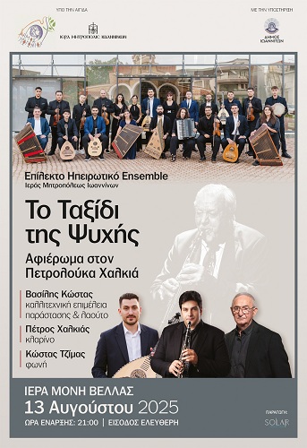 Η φετινή συναυλία του Επίλεκτου Ηπειρωτικού Ensemble της Ιεράς Μητρόπολης Ιωαννίνων θα πραγματοποιηθεί την Τετάρτη 13 Αυγούστου στις 9:00 μ.μ. στον ιστορικό χώρο της Ιεράς Μονής Βελλάς και είναι αφιερωμένη στον μεγάλο δάσκαλο της ηπειρωτικής μουσικής, Πετρολούκα Χαλκιά. Η συναυλία με τίτλο «Το Ταξίδι της Ψυχής» τιμά τη σπουδαία παρακαταθήκη του, που με το κλαρίνο του ανέδειξε τη μουσική της Ηπείρου διεθνώς και καθόρισε όσο λίγοι τον ήχο του Πωγωνίου.