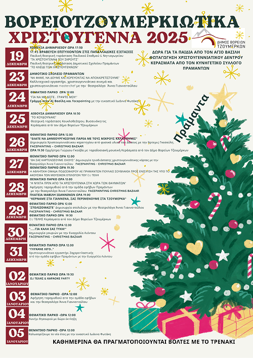 Με επίκεντρο τη φωταγώγηση του χριστουγεννιάτικου δέντρου και ένα πλούσιο πρόγραμμα δράσεων για μικρούς και μεγάλους, ο Δήμος Βορείων Τζουμέρκων παρουσιάζει τις «Βορειοτζουμερκιώτικες Χριστουγεννιάτικες Εκδηλώσεις 2025», που απλώνονται χρονικά από τις 19 Δεκεμβρίου έως και τις 5 Ιανουαρίου.