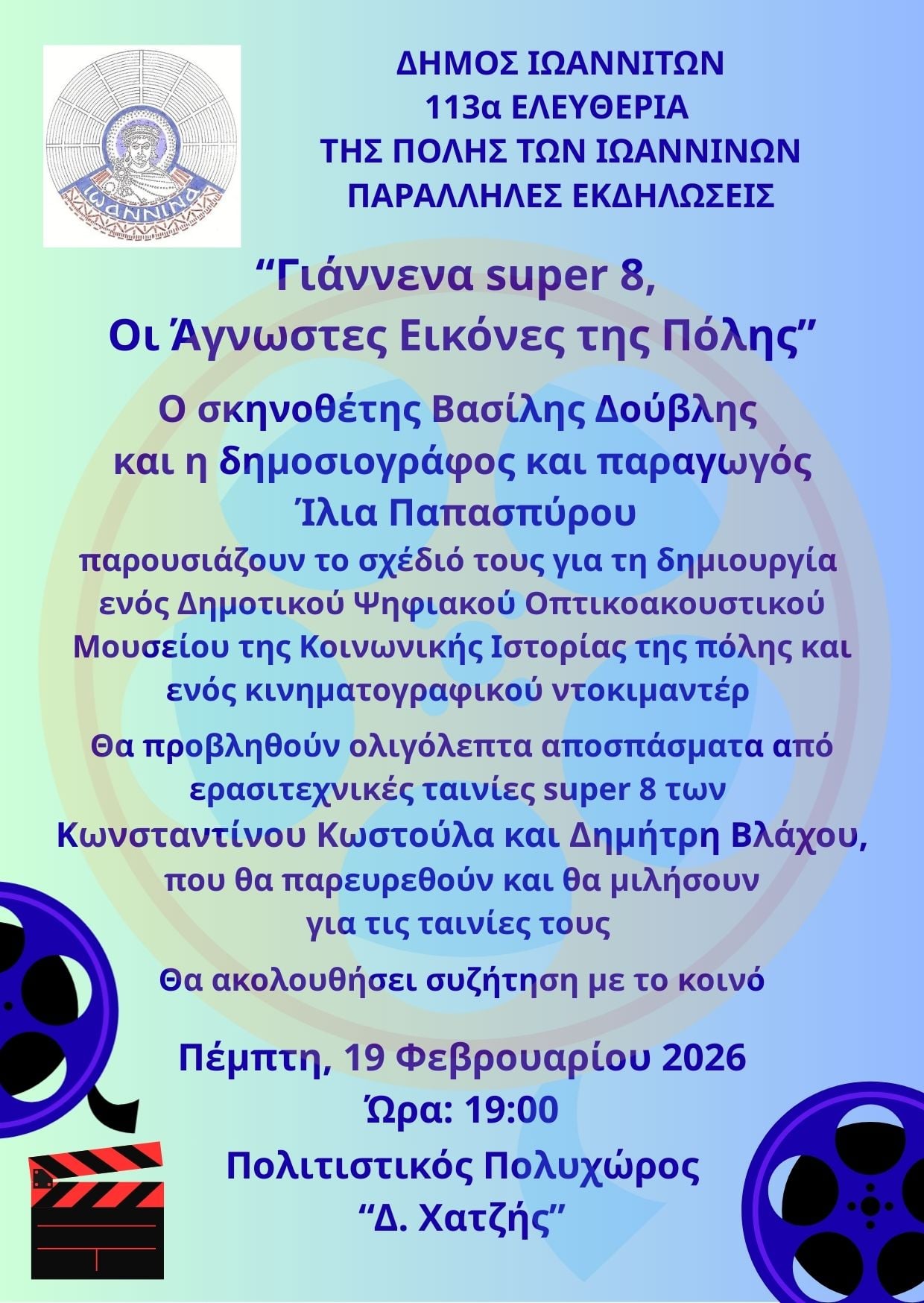 Ο σκηνοθέτης Βασίλης Δούβλης και η δημοσιογράφος και παραγωγός Ίλια Παπασπύρου παρουσιάζουν την Πέμπτη, 19 Φεβρουαρίου 2026 και ώρα 19:00, στον Πολιτιστικό Πολυχώρο “Δ. Χατζής” το σχέδιό τους για τη δημιουργία ενός Δημοτικού Ψηφιακού Οπτικοακουστικού Μουσείου της Κοινωνικής Ιστορίας της πόλης και ενός κινηματογραφικού ντοκιμαντέρ.