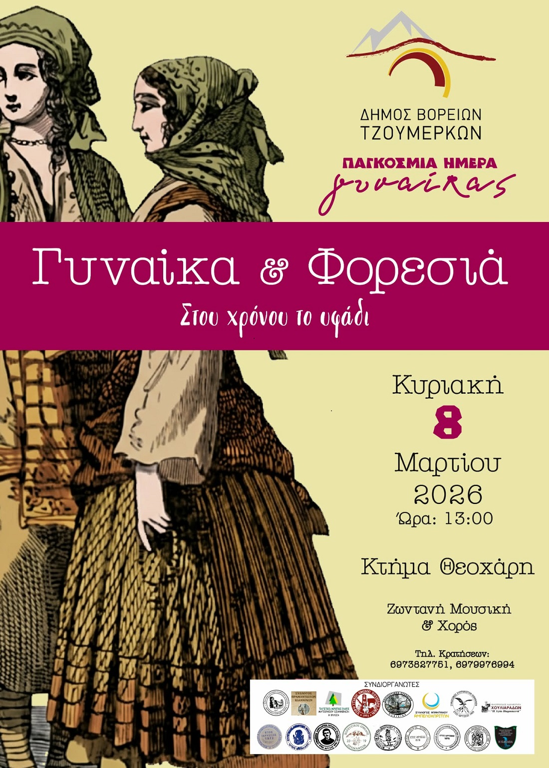 Την εκδήλωση «Γυναίκα & Φορεσιά – Στου χρόνου το υφάδι» διοργανώνει ο Δήμος Βορείων Τζουμέρκων την Κυριακή 8 Μαρτίου, στη 1 το μεσημέρι, στο «Κτήμα Θεοχάρη», με αφορμή την Παγκόσμια Ημέρα της Γυναίκας.