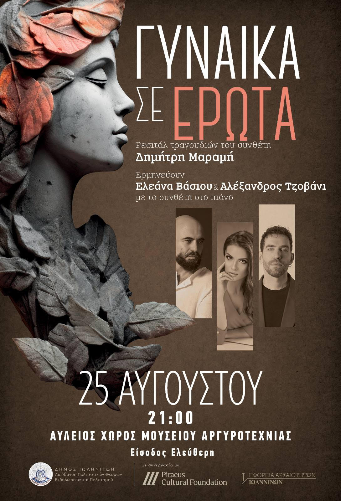 ΤηνΚυριακή 25 Αυγούστου 2025 και ώρα 21:00, στον Αύλειο Χώρο του Μουσείου Αργυροτεχνίας, το κοινό καλείται να απολαύσει μία μοναδική μουσική βραδιά, όπου η γυναικεία ψυχή, ο έρωτας και η ποίηση γίνονται σώμα και φωνή μέσα από τα έργα του Δημήτρη Μαραμή.