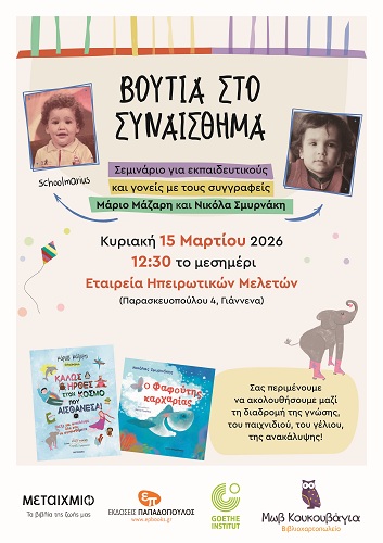 Το Goethe-InstitutAthen, το βιβλιοπωλείο «Μωβ Κουκουβάγια», οι εκδόσεις Παπαδόπουλος και οι εκδόσεις Μεταίχμιο προσκαλούν το κοινό σε ένα διαφορετικό, βιωματικό σεμινάριο για εκπαιδευτικούς και γονείς, που θα πραγματοποιηθεί από τους συγγραφείς Μάριο Μάζαρη (Schoolmarius) και τον Νικόλα Σμυρνάκη.