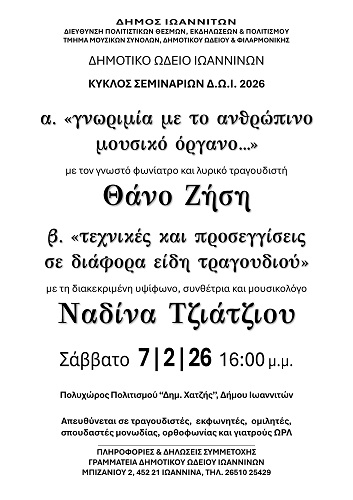 Το Δημοτικό Ωδείο Ιωαννίνων, στο πλαίσιο του Κύκλου Σεμιναρίων του για το 2026, διοργανώνει