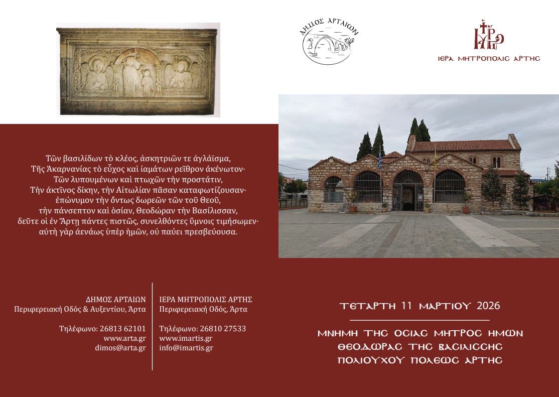 Ο Δήμος Αρταίων ανακοινώνει το πρόγραμμα των εκδηλώσεων για τον εορτασμό της Πολιούχου της πόλης, Αγίας Θεοδώρας, που θα πραγματοποιηθούν την Τρίτη 10 και την Τετάρτη 11 Μαρτίου 2026.