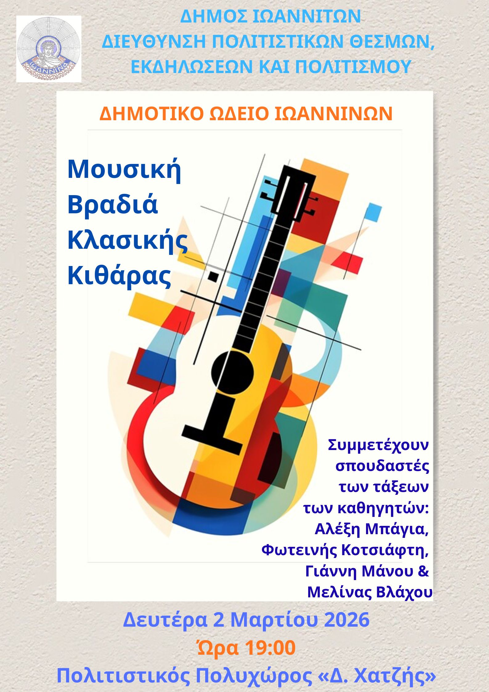 Η Σχολή Κλασικής Κιθάρας του Δημοτικού Ωδείου Ιωαννίνων παρουσιάζει τη Δευτέρα 2 Μαρτίου 2026, στις 7.00 μ.μ., στον Πολιτιστικό Πολυχώρο «Δ. Χατζής», έργα Ελλήνων και ξένων συνθετών.