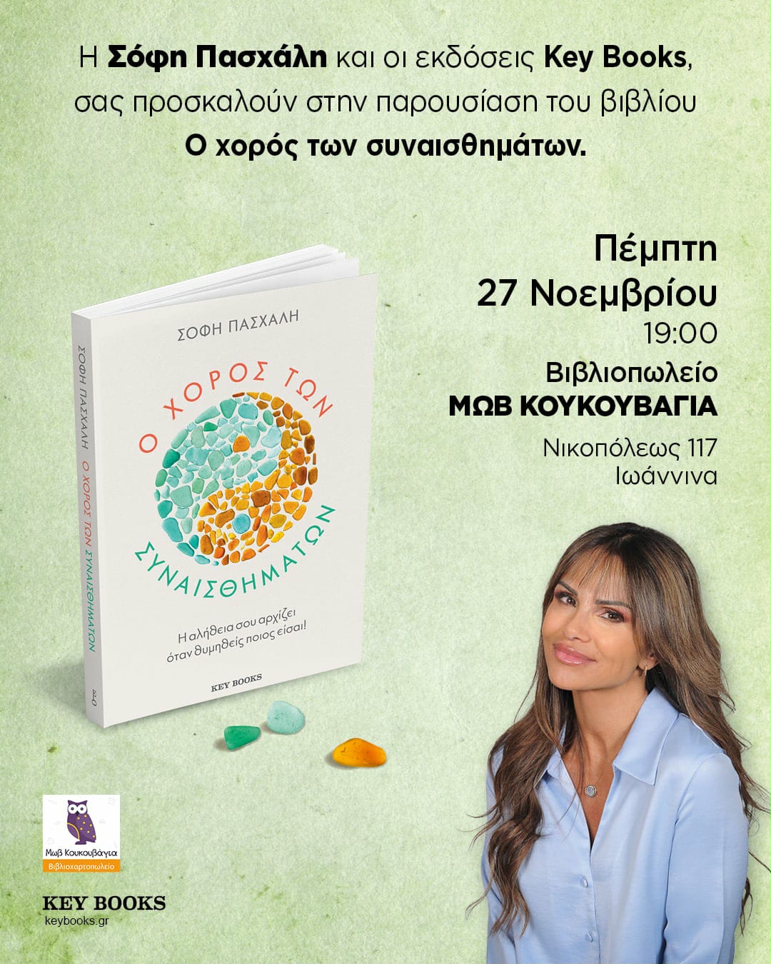 Η Σόφη Πασχάλη και οι εκδόσεις KeyBooks σας προσκαλούν στην παρουσίαση του βιβλίου “Ο χορός των συναισθημάτων” την Πέμπτη 27 Νοεμβρίου 2025 στις 19:00 στο βιβλιοπωλείο “Μωβ Κουκουβάγια” {Νικοπόλεως 117, Ιωάννινα}.