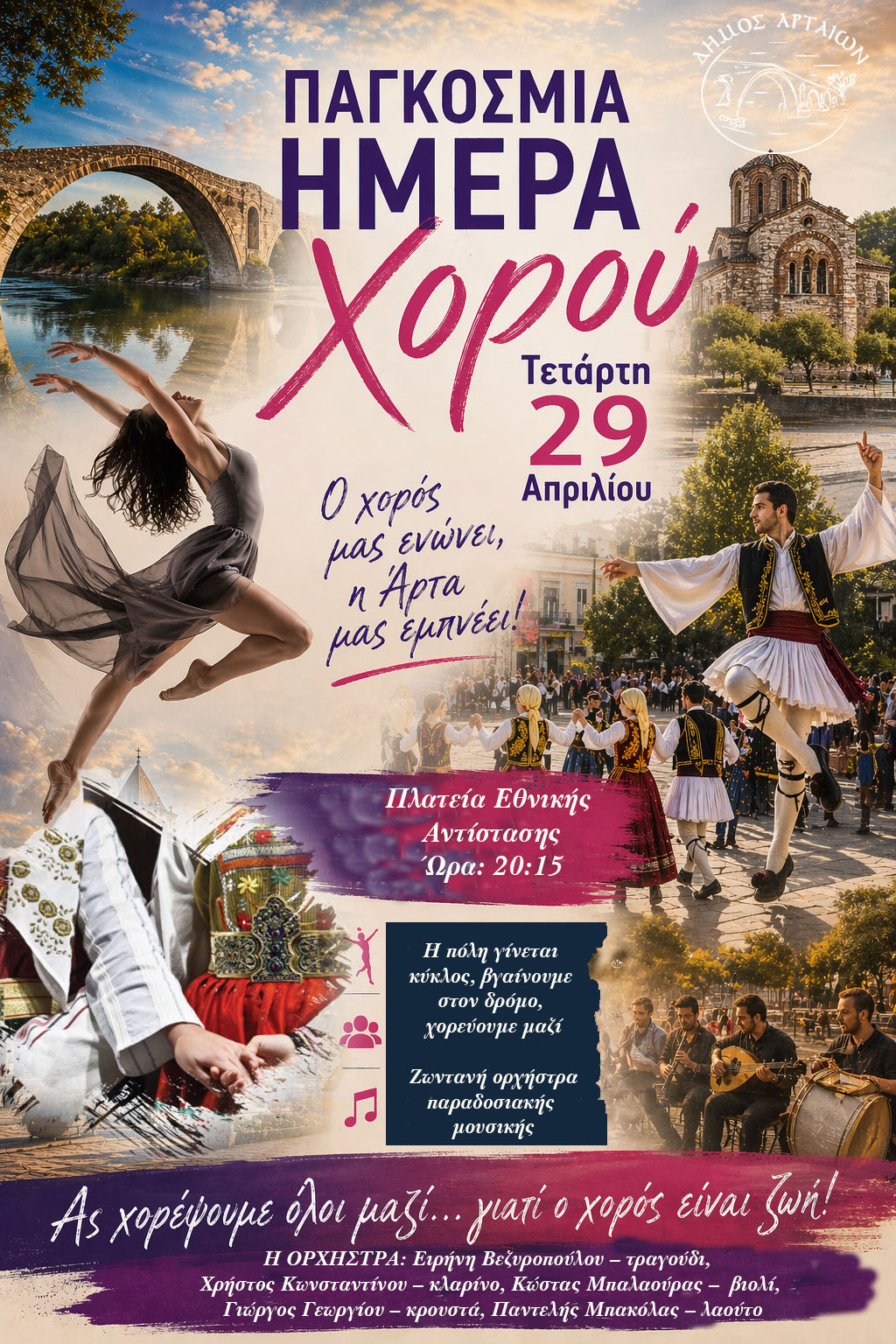 Με σύνθημα «Ο χορός μάς ενώνει, η Άρτα μάς εμπνέει», η βραδιά θα πλαισιώθειμε ζωντανή ορχήστρα παραδοσιακής μουσικής με τους: