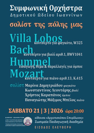 Ο Δήμος Ιωαννιτών και η Διεύθυνση Πολιτιστικών Θεσμών, Εκδηλώσεων και Πολιτισμού διοργανώνουν συναυλία της Συμφωνικής Ορχήστρας του Δημοτικού Ωδείου Ιωαννίνων, το Σάββατο 21 Μαρτίου 2026 και ώρα 20:00, στην αίθουσα «Αρχιεπισκόπου Σπυρίδωνος» της Ζωσιμαίας Παιδαγωγικής Ακαδημίας.