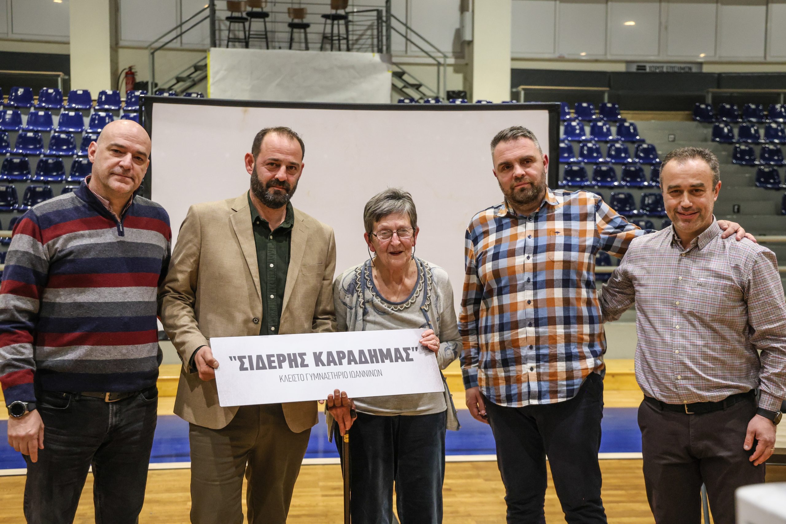 Και αμέσως μετά ο πρόεδρος της Επιτροπής Λειτουργίας, αναφέρθηκε στο τιμώμενο πρόσωπο, στον Σιδέρη Καραδήμα: «Είμαστε εδώ για να τιμήσουμε έναν άνθρωπο που το όνομά του ήταν άρρηκτα συνδεδεμένο με το άθλημα του μπάσκετ στα Γιάννενα και έτσι πρέπει να παραμείνει. Για τον Σιδέρη Καραδήμα θα σας πει περισσότερα ο κ. Παπαλουκάς… εγώ το μόνο που θέλω να πω είναι πως ο Σιδέρης μας αγαπούσε σαν να ήμασταν παιδιά του και ήρθε η ώρα να του το ανταποδώσουμε. Ήρθε η ώρα το όνομά του να μείνει ανεξίτηλο στο μυαλό όχι μόνο όλων εμάς που τον ζήσαμε, αλλά και όσων δεν τον γνώρισαν ποτέ. Ήρθε η στιγμή το Νέο Κλειστό να παραχωρήσει το όνομά του στον Σιδέρη Καραδήμα».