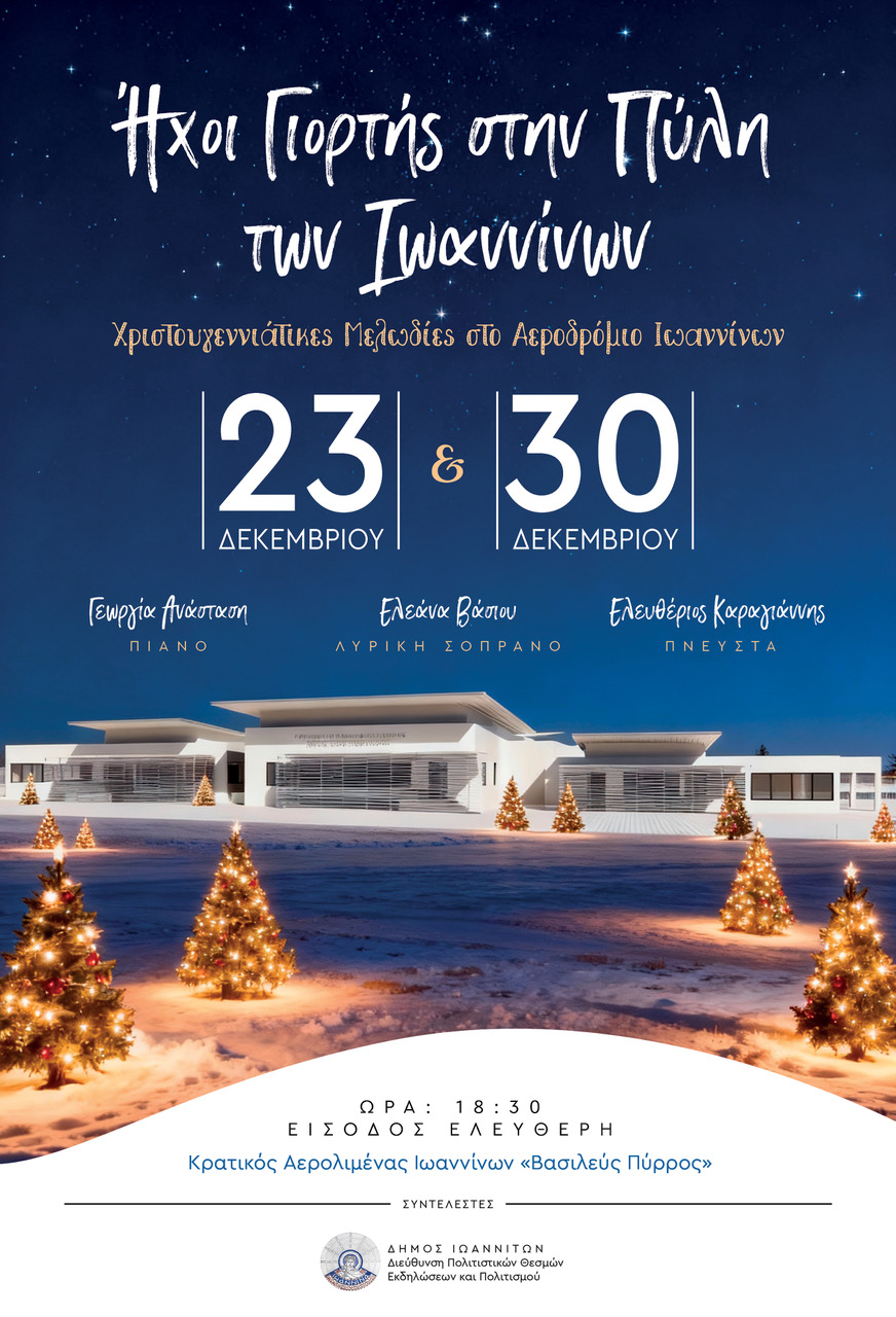 Την Τρίτη 23 και την Τρίτη 30 Δεκεμβρίου 2025, ο Δήμος Ιωαννιτών και η Διεύθυνση Πολιτιστικών Θεσμών, Εκδηλώσεων και Πολιτισμού διοργανώνουν ένα ρεσιτάλ με τίτλο: «Ήχοι Γιορτής στην Πύλη των Ιωαννίνων», στο Αεροδρόμιο Ιωαννίνων, στις 18:30.