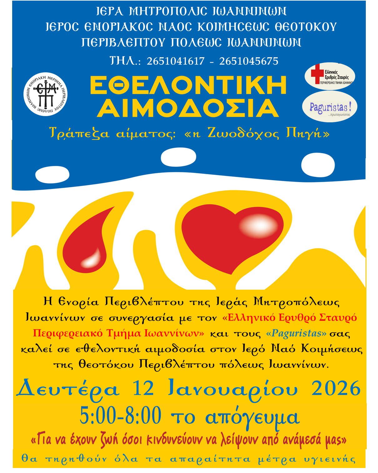 Η Ενορία της Περιβλέπτου πόλεως Ιωαννίνων, στα πλαίσια της ποιμαντικής της μέριμνας, σε συνεργασία με τον Ερυθρό Σταυρό Ιωαννίνων και τους Pagouristas, οργανώνει Εθελοντική Αιμοδοσία, στην αίθουσα εκδηλώσεων του Ιερού Ναού Κοιμήσεως της Θεοτόκου ενορίας Περιβλέπτου πόλεως Ιωαννίνων, την Δευτέρα 12 Ιανουαρίου 2026 και από ώρα 5.00΄ έως ώρα 8.00΄ το απόγευμα.