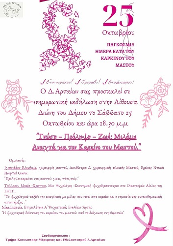 Ο Δήμος Αρταίων, στο πλαίσιο της Παγκόσμιας Ημέρας κατά του Καρκίνου του Μαστού, προσκαλεί σε ενημερωτική εκδήλωση με θέμα:«Γνώση – Πρόληψη – Ζωή: Μιλάμε Ανοιχτά για τον Καρκίνο του Μαστού»